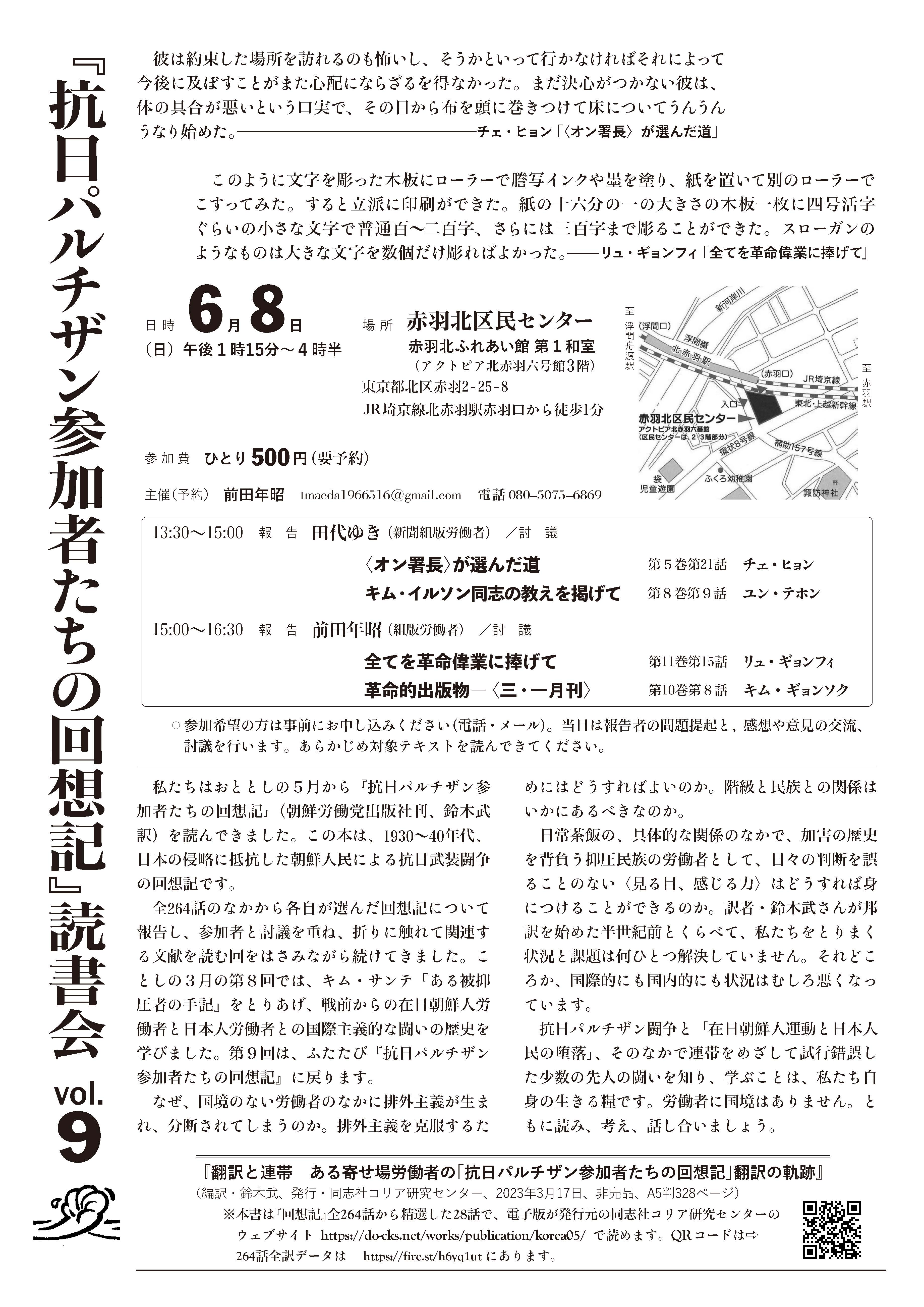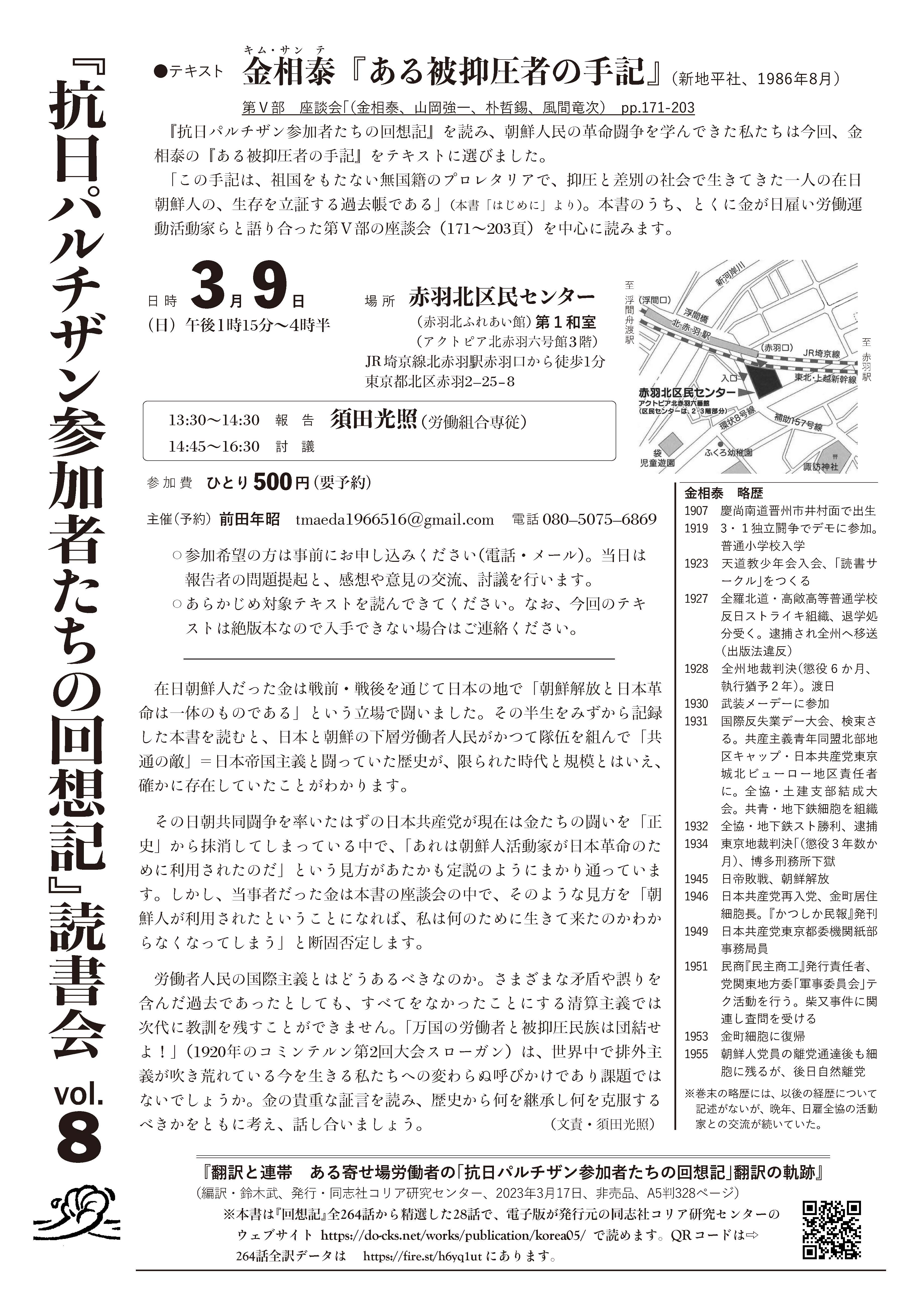 労働者人民の国際主義とはどうあるべきなのか。さまざまな矛盾や誤りを含んだ過去であったとしても,すべてをなかったことにする清算主義では次代に教訓を残すことができません。「万国の労働者と被抑圧民族は団結せよ!」(1920年のコミンテルン第2回大会スローガン)は,世界中で排外主義が吹き荒れている今を生きる私たちへの変わらぬ呼びかけであり課題ではないでしょうか。金の貴重な証言を読み,歴史から何を継承し何を克服するべきかをともに考え,話し合いましょう。 〔広報ビラから転載〕- 3月9日(日)午後1時15分~4時半