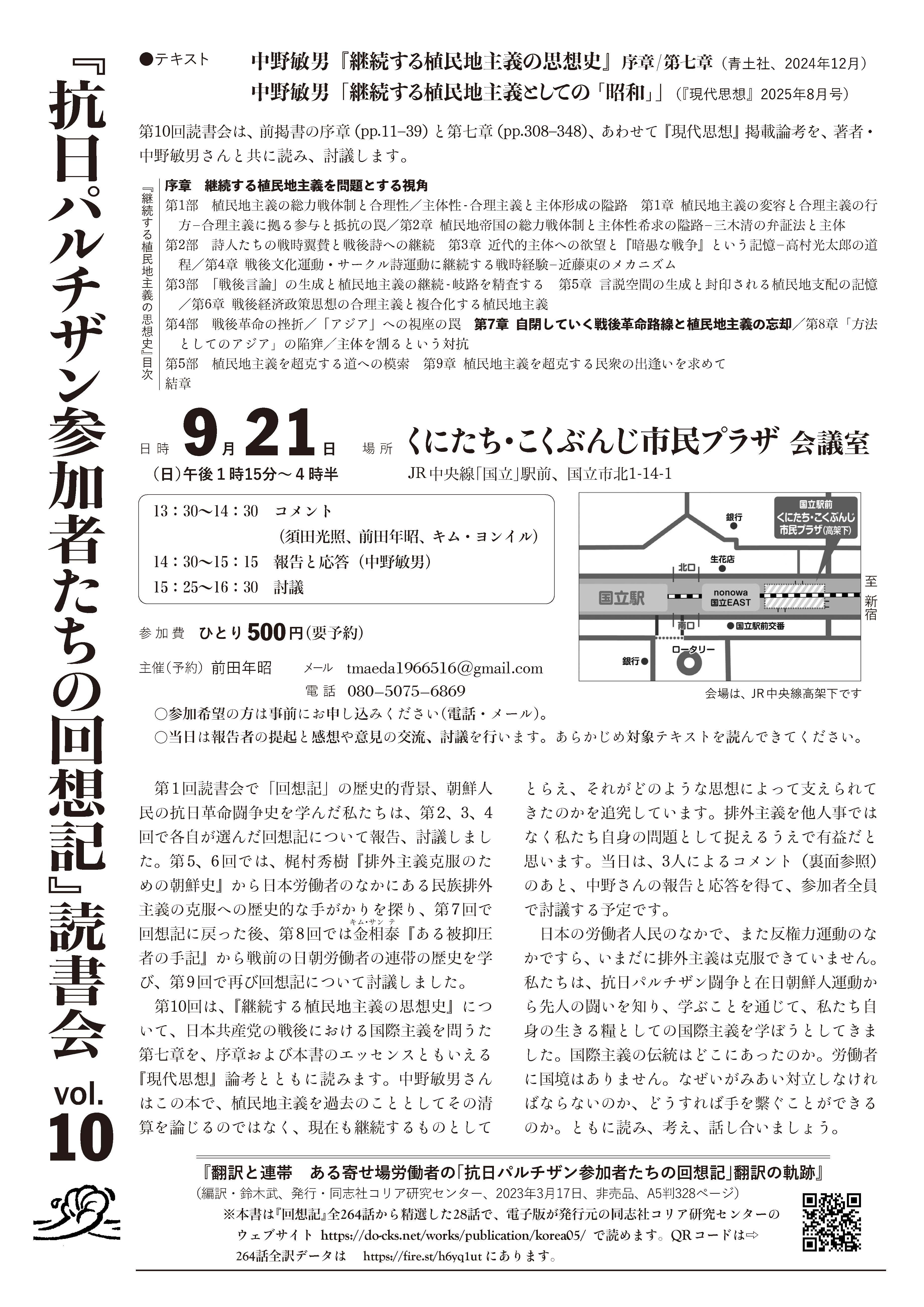 第10回は, 『継続する植民地主義の思想史』について, 日本共産党の戦後における国際主義を問うた第七章を, 序章および本書のエッセンスともいえる『現代思想』論考とともに読みます。中野敏男さんはこの本で, 植民地主義を過去のこととしてその清算を論じるのではなく, 現在も継続するものとしてとらえ, それがどのような思想によって支えられてきたのかを追究しています。排外主義を他人事ではなく私たち自身の問題として捉えるうえで有益だと思います。当日は, 3人によるコメント(裏面参照)のあと, 中野さんの報告と応答を得て, 参加者全員で討議する予定です。