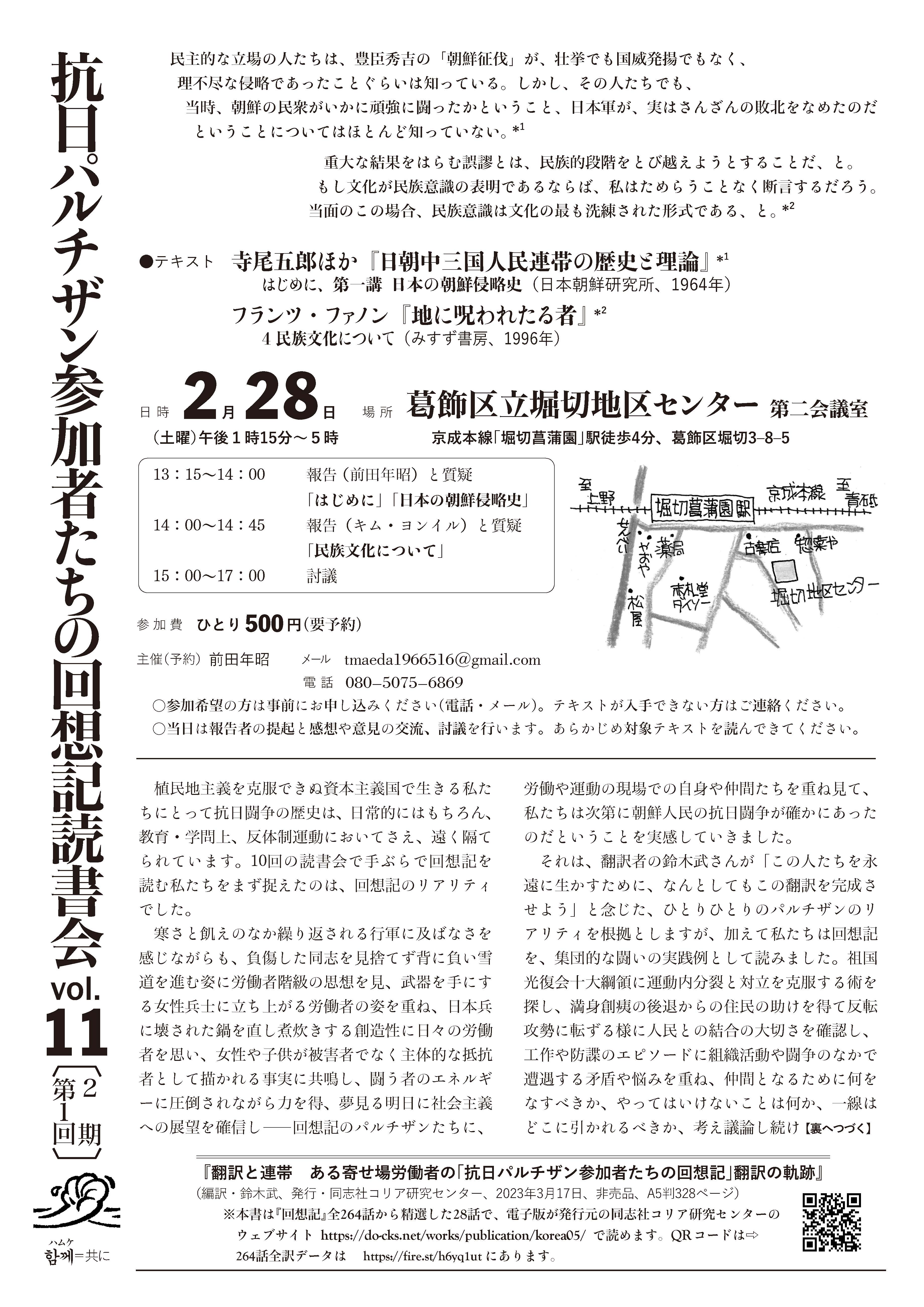 日本の労働者人民のなかで, また反権力運動のなかですら, いまだに排外主義は克服できていません。私たちは, 抗日パルチザン闘争と在日朝鮮人運動から先人の闘いを知り, 学ぶことを通じて, 私たち自身の生きる糧としての国際主義を学ぼうとしてきました。国際主義の伝統はどこにあったのか。労働者に国境はありません。なぜいがみあい対立しなければならないのか, どうすれば手を繫ぐことができるのか。ともに読み, 考え, 話し合いましょう。[広報ビラから]- 9月21日(日)午後1時15分~4時半