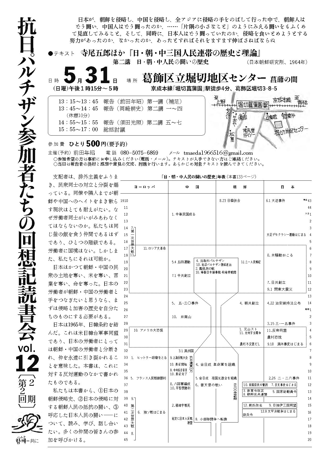 私たちは本書から、①日本の朝鮮侵略史、②日本の侵略に対する朝鮮人民の抵抗の闘い、③呼応した日本人民の闘い――について、読み、学び、話し合いたい。多くの仲間の皆さんの参加を呼びかける。- 5月31日(日曜)午後1時15分~5時半